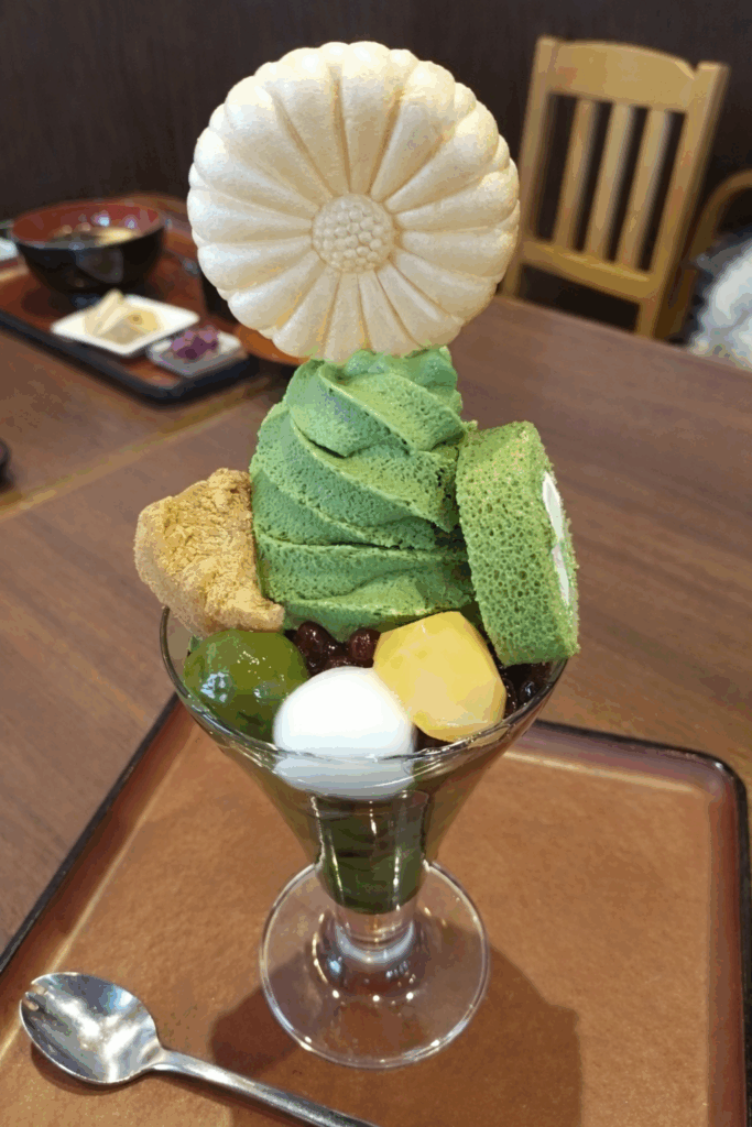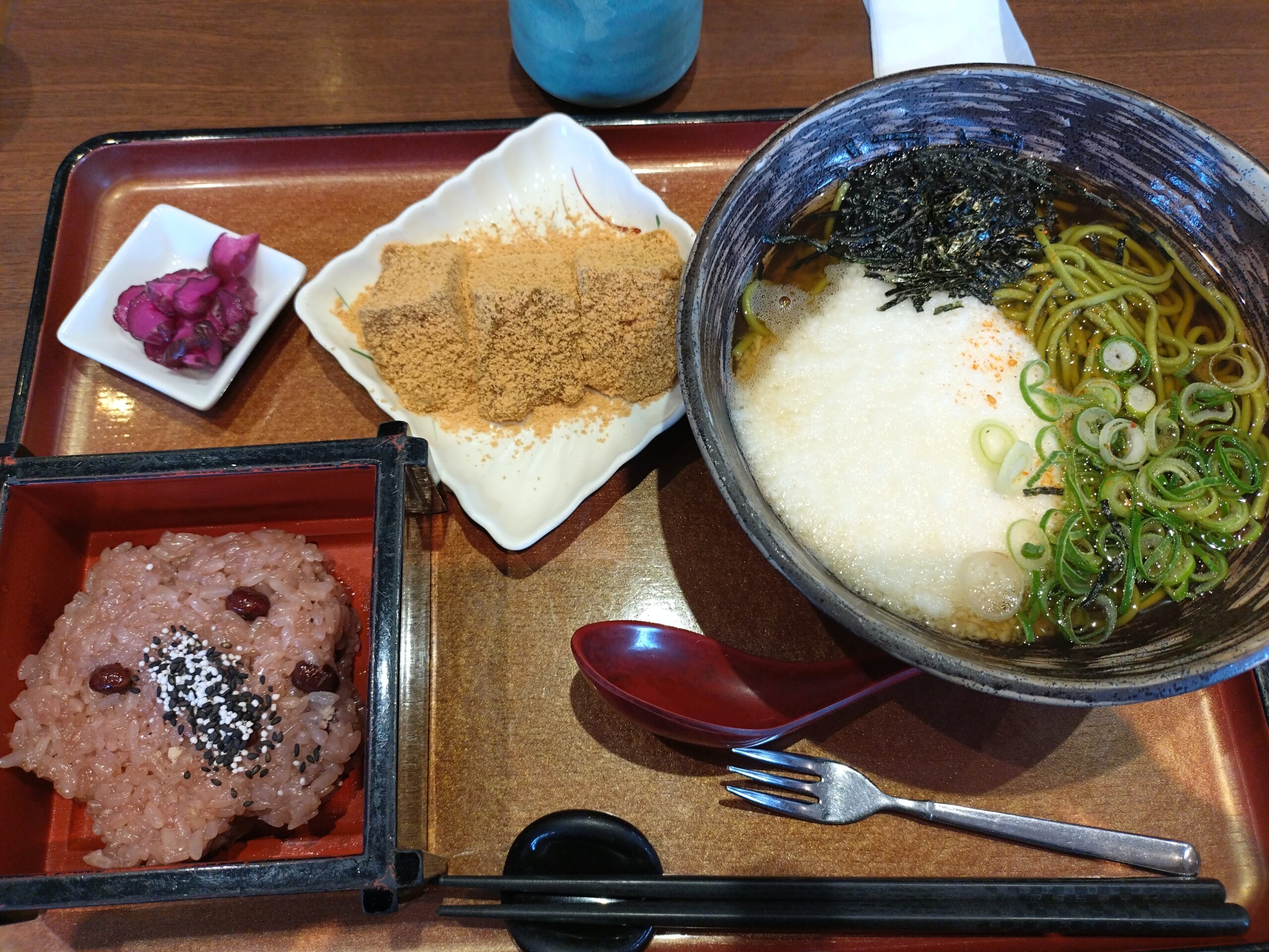 息子と半分しながら暖かいやまかけ茶そばと抹茶パフェをいただきました😋